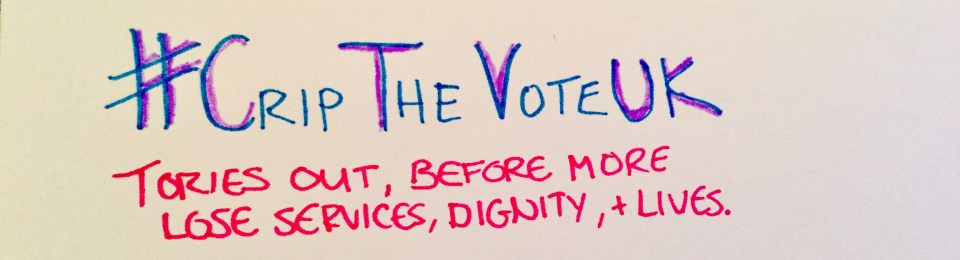 Inevitably, a large part of the movement is based on drawing attention to parties’ policies which affect the disabled community, and urging people to vote accordingly. For that reason, many of those participating in #CripTheVoteUK are committed to ousting the Tories who have caused unrelenting misery for disabled people in the UK since 2010 – be it from increasingly unfair ATOS or Maximus assessments, cuts to Legal Aid, NHS service cuts, cuts to disability benefits – disabled people have borne the brunt of the cuts made to keep our economy afloat, while the richest pay minimal tax and hide their money in offshore accounts. (By contrast, Jeremy Corbyn has repeatedly voted against benefit cuts, against the bedroom tax, and for increasing benefits in line with inflation – oh, and making millionaires pay their taxes!) Disabled people in the UK are literally dying from starvation, illnesses worsened by stress and poverty, even suicide after benefit errors, going without care hours when reclassified as being in less need, even being denied the wheelchairs that would help them engage in the community by the NHS who have been told to save money by tightening the eligibility criteria. We are being shat on from all sides, and we are sick of it. That is why Crip The Vote is so important; it gives us some agency back.